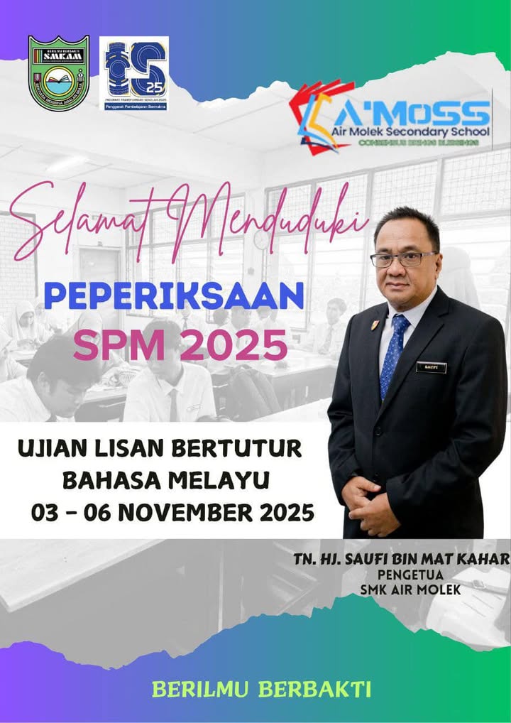 Warga SMK Air Molek mengucapkan selamat maju jaya kepada semua calon SPM 2025, khususnya yang akan menduduki Ujian Lisan Bertutur Bahasa Melayu pada 3 – 6 November 2025.
